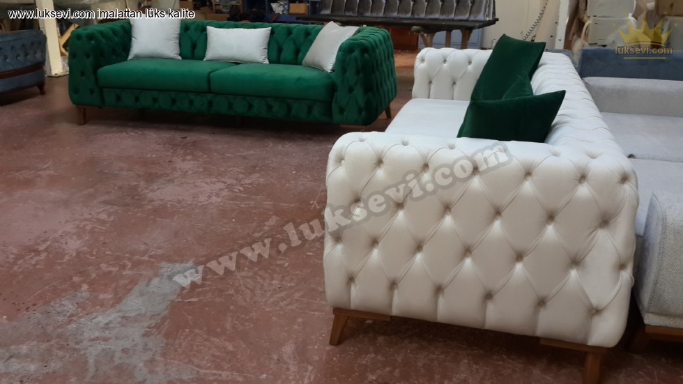 İtalyan modern chester koltuk takımı yataklı sistemi müşterimizin tercih ettiği yeşil beyaz kumaş ile kaplandı. Lüksevi Koltuk ile baklava dilimli chester koltuk takımlarını zevkinize göre yaptırın. Üretimden uygun fiyatlar ve en iyi kalite sizleri bekliyor.